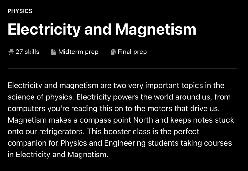 “I was hesitant to take this booster class because I’m a freshman and I had only passed Physics 1, but I was impressed with how welI I did. The chapters are ordered in such a way that it’s easy to follow the entire course even if you’ve only taken Mechanics before. Having the list of required skills to learn is very useful because you can always come back to review them if you need to, or go directly to a specific topic.”
